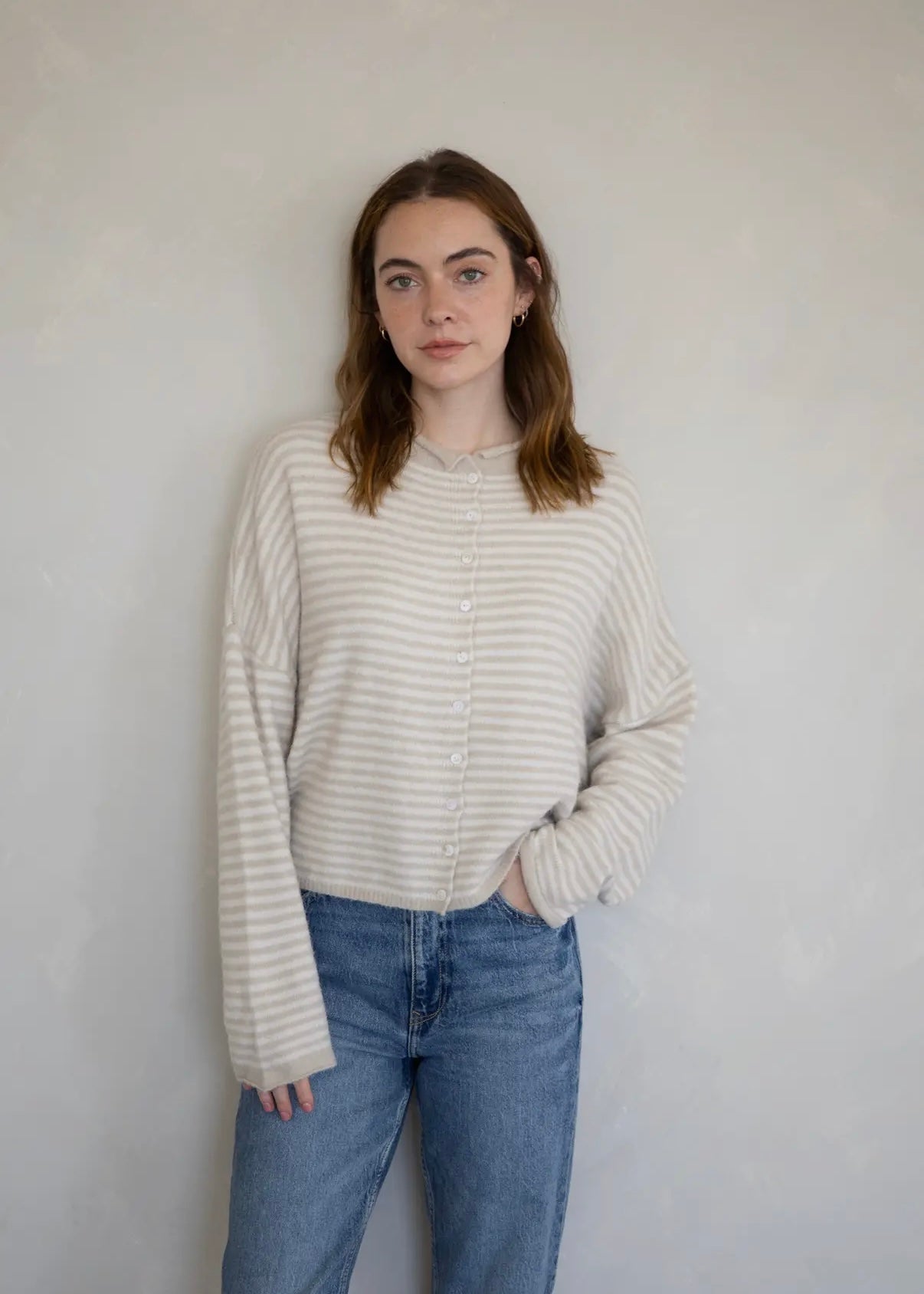 Elevate your casual wardrobe with our Piper Button-Front Cardigan — the perfect layering piece for effortless style and everyday comfort. Crafted from a luxuriously soft knit in a versatile neutral color, this classic cardigan features a flattering relaxed fit, delicate ribbed trim, and a full button-up front with dainty, pearl-toned buttons. This piece is lightweight and breathable making it perfect all day wear! The neutral color allows for endless styling options.